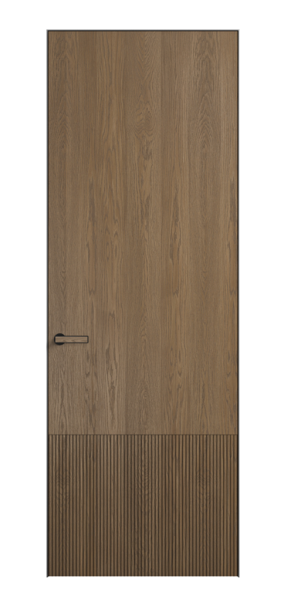 Это полотна с рельефной фрезеровкой. Этот прием делает интерьер объемным, тактильным, вносит интересную текстуру и создает современный образ. Волнистый рельеф может быть выполнен по ламелям из массива дуба в древесных матовых отделках, либо исполнен по натуральному и экологически безопасному материалу — ХДФ, покрытому гладкой эмалью актуальных оттенков.